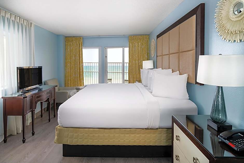 Oceanfront Studio King (1 King Bed) is 151 square feet and includes a king-size bed 150-183 width plus balcony, desk, cable tv, hairdryer, tea and coffee making facilities , and ironing set.